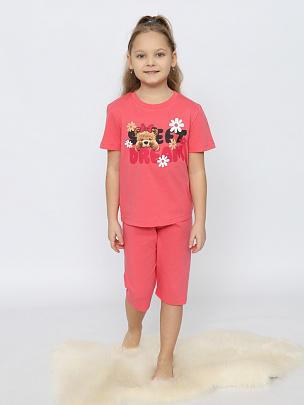 Гладкокрашенная пижама из джемпера и бридж. Джемпер свободного покроя с рукавом 3/4. Горловина обработана притачной бейкой из рибаны с лайкрой. Перед оформлен принтом. Бриджи прямые умеренного объёма длиной ниже колена выполнены из полотна дополнительного цвета. Цельнокроенный пояс обработан плоским швом вподгибку с одновременным прокладыванием резинки. На левой стороне - принт.