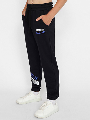 Брюки с притачным поясом и манжетами. В пояс вставлена резинка и функциональный шнур. Пояс и манжеты выполнены из полотна с эластаном. В боковой части брюк располагаются карманы. На передней части в области колена расположен декоративный подрез. На задней части брюк расположена декоративная вставка контрастного цвета. Карман декорирован вязаной нашивкой.