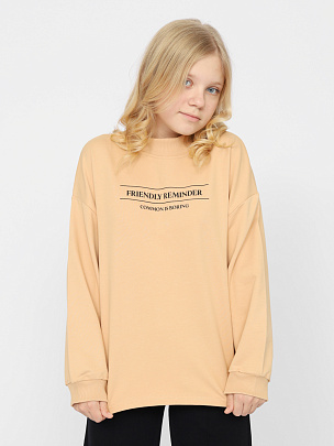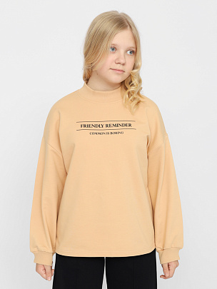 Джемпер для девочки с длинными рукавами и спущенными плечами. Горловина обработана воротником-стойкой из полотна с эластаном. Рукава с эластичными манжетами. Перед джемпера декорирован принтом.