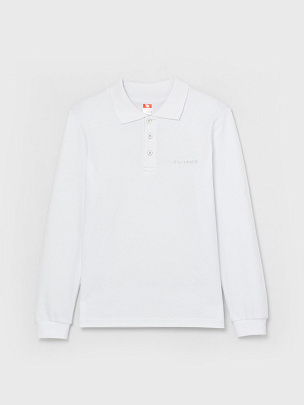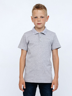 Джемпер для девочки с короткими рукавами, свободного силуэта, спущенным плечом и отложным воротником. Сзади застежка на пуговицу. Спереди декорирован металлическим лейблом.