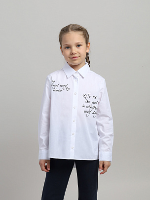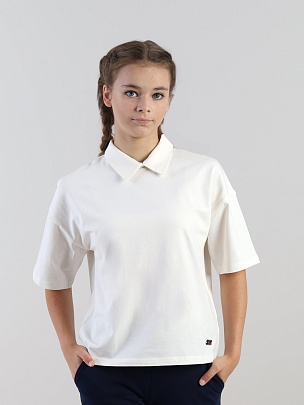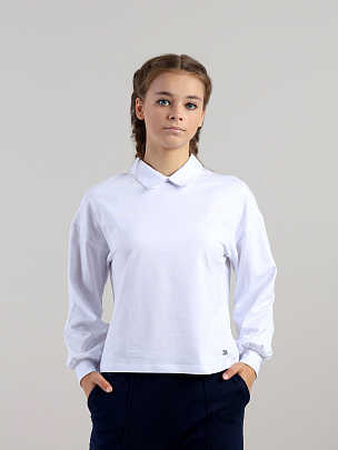 Джемпер для девочки с длинными рукавами и отложным воротником из кулирки, свободного силуэта. Рукава объемные, со спущенным плечом, снизу манжет из кулирки. Спинка с вырезом-капелькой и застёжкой на пуговицу-бусину с петлёй.