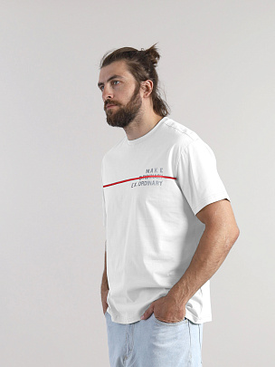 Футболка oversize со спущенным плечом, с коротким рукавом. Горловина круглая, обработана притачной бейкой из рибаны с лакрой. Плечевые швы смещены на перед и отстрочены. Перед оформлен принтом.